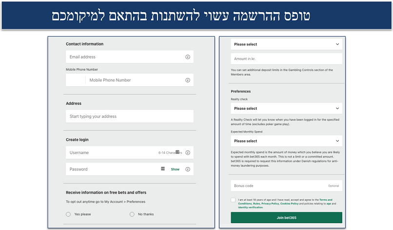 אם עדיין אין לכם חשבון פעיל, תוכלו להירשם ל-bet365 דרך האתר או היישום שלו. אשרו את מדינת המגורים שלכם כדי לוודא שאתם יכולים להשתמש בפלטפורמה באופן חוקי. זהו צעד חשוב לצורך עמידה בתנאי הפלטפורמה והימנעות מבעיות פוטנציאליות בחשבון.
