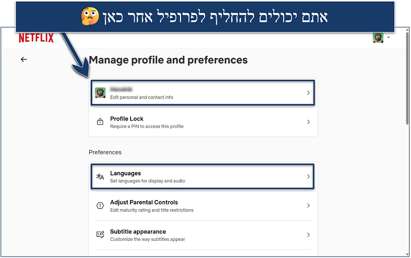 - בחרו את השפות המועדפות עליכם. הקישו על הפרופיל שתרצו לשנות ואז על שפת שמע וכתוביות.